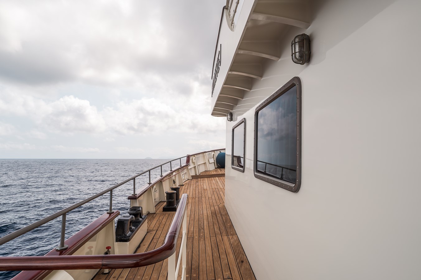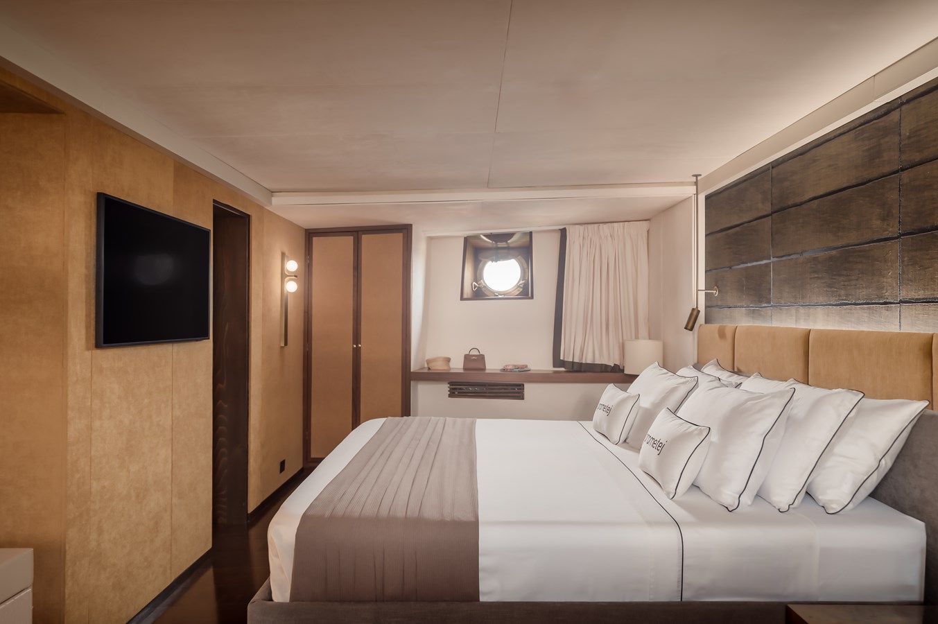 ACCOMMODATION Master cabin with ensuite bathroom on Upper Deck, featuring refreshed upholstery (2025) and newly installed portholes for fresh air.