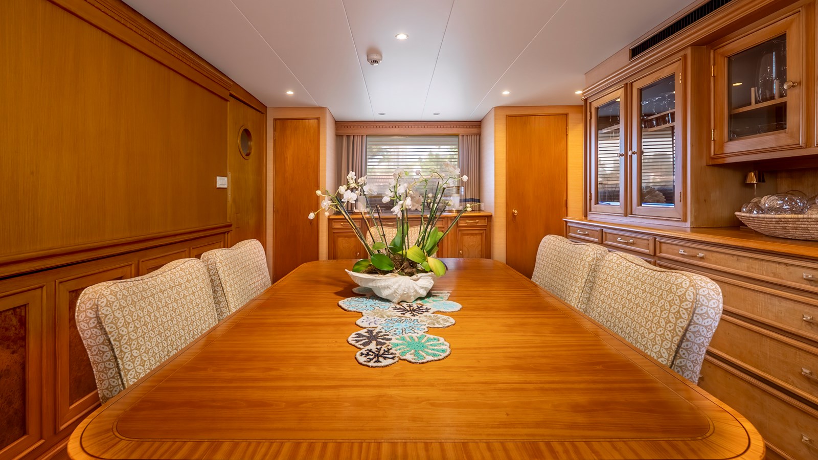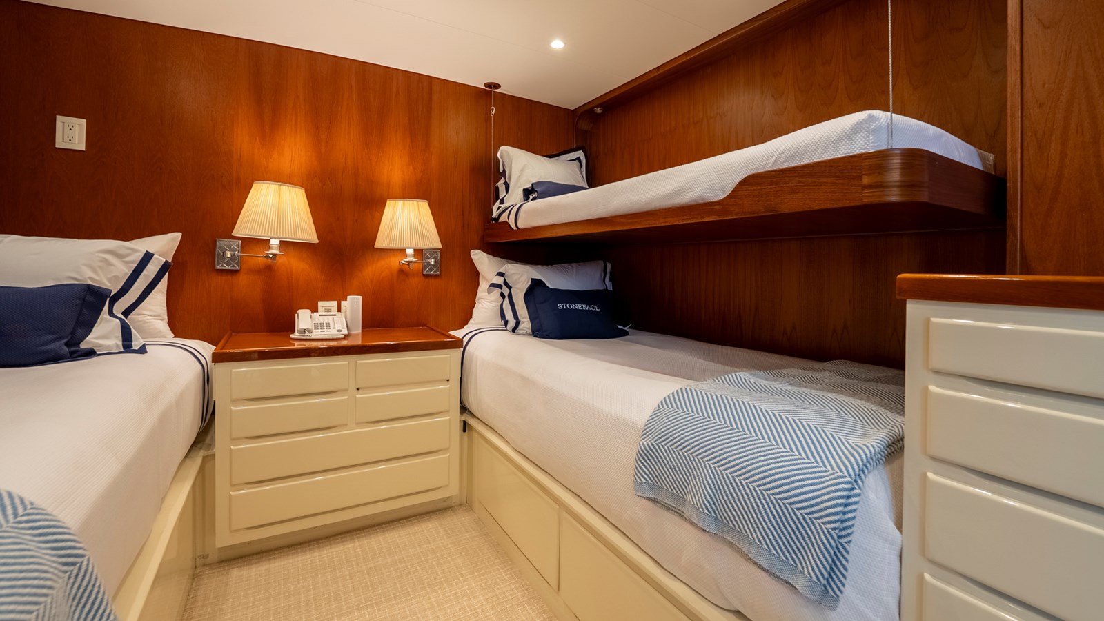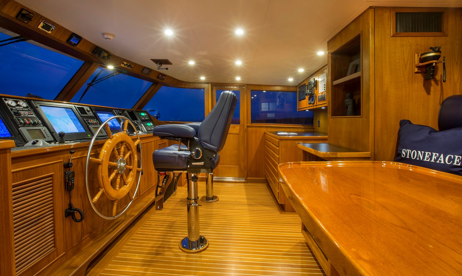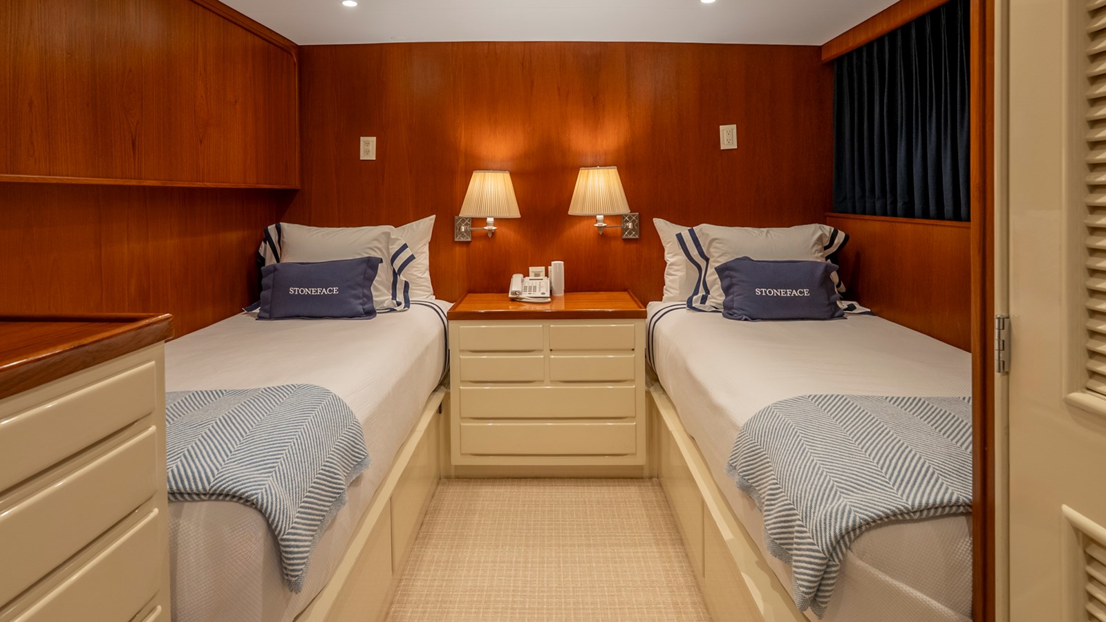 Stepping aboard STONEFACE, one immediately recognizes the pedigree and classic charm of this Burger-built yacht — solid, beautifully maintained, and thoughtfully designed for comfortable cruising. Boarding from the starboard side aft boarding ladder and walking aft, you enter through a side, hinged door into the enclosed main deck aft, a full-beam space surrounded by large windows. Both port and starboard side windows open to allow natural airflow when desired. The area serves as a relaxed, social setting with a dining table for six and two built-in L-shaped sofas aft, offering ample seating for guests. Forward, twin service bars provide excellent storage and functionality, and include refrigeration, an icemaker, and a sink. Access to the expansive lazarette is through a hatch in the floor, aft of the dining table. A centrally located door between the aft sofas leads down three steps to the teak cockpit. Varnished cap rails surrounds the area, while a gate on the starboard side opens to the swim platform, accessed by another three steps concealed by a teak hatch in the deck. Returning to the enclosed aft deck, the space is fully air-conditioned and includes a discreet crew call button at the dining table for service when entertaining. Through a sliding centerline door, the main salon welcomes you with warm tones of butternut walnut joinery and soft, neutral furnishings. To starboard is a card table for four, ideal for a quiet game or conversation. To port, a curved staircase leads down to the guest accommodations. Six large windows flood the room with natural light, enhancing the sense of space. An L-shaped sofa upholstered in a light fabric faces forward toward and two brand new, comfortable armchairs are located to starboard. The television is mounted opposite the sofa, framed by shelving on either side and cabinetry below. End tables with lamps provide soft evening light, making the salon an inviting place to relax. Following the curved staircase in the aft main salon down, you arrive in the guest foyer. Aft lies the full-beam master cabin with king size bed, offering a calm and private retreat. The layout features built-in nightstands, cabinetry, and full-height closets to port and starboard, providing abundant storage. A cabinet opposite the berth adds additional storage space, and a wall-mounted television is positioned to port. The en suite bath, accessed to starboard, includes a single sink with ample storage below, twin mirrored medicine cabinets, and a tiled shower with a glass door and built-in bench. The space benefits from a porthole for natural light. The cabin itself has two portholes per side, creating an open, balanced feel. Forward of the master, a well-equipped stewardess laundry room includes a Miele washer and dryer, sink, and large storage closet. Continuing forward, a linen locker lines the passageway before reaching two identical twin guest cabins. Each features twin berths with a Pullman berth above, drawer storage, a full-height closet, two portholes, and a wall-mounted television. Both cabins have en suite baths with single sinks, medicine cabinets, glass-enclosed showers, and tilework. Back on the main deck, the formal dining area is positioned forward of the main salon and centered around a rectangular table with leaf for six. Large windows on both sides allow natural light to illuminate the space. Built-in cabinetry aft and to starboard provides storage for china, glassware, stemware, and linens, keeping the area tidy and functional. Through a swinging wooden door forward, you enter the stew galley, finished in butternut walnut with a butcher block countertop and beautiful teak and holly flooring. The space is fitted with a Hoshizaki icemaker, Kenmore sink, KitchenAid dishwasher, U-Line wine refrigerator, Continental half-size refrigerator, and GE microwave. Wall-mounted cabinets provide additional pantry storage. To starboard, a day head features a toilet, sink, and mirror with polished stone accents. Behind the entry door, a coat closet is conveniently located. Side doors on both port and starboard sides lead to the exterior decks for easy crew and guest access. Continuing forward, the main galley spans the full beam and is finished with stunning, stainless steel counters and backsplash behind the cooktop. Appliances include a Wolf induction cooktop, Wolf oven, GE oven, GE microwave, three Samsung refrigerator/freezers, a large stainless sink with dual drains, a Miele dishwasher, and a pot filler. The space enjoys excellent natural light from windows on both sides and is thoughtfully laid out for professional use, with extensive storage and work surfaces for meal preparation. A curved staircase leads from the stew galley up to the pilothouse, a bright and functional space featuring a built-in settee and rectangular table to port, as well as teak and holly sole. Two helm chairs face a well-organized console with classic wheel and controls. Chart storage is located to starboard, and large windows ensure excellent visibility. Aft of the pilothouse is a compact cabin with a single berth- an ideal space for use on overnight passages. A head is located cross from the cabin with toilet and sink. Side doors on both sides of the pilothouse provide quick access to the wing stations for docking and maneuvering. Access to the flybridge is gained through doors to both port and starboard sides from the pilothouse. The deck surface is finished in a combination of teak and non-skid. This area serves as storage for the inflatable tender, two cranes, and any additional water toys. Aft, she features a teak seating area with u-shaped seating and a dining table for four, complemented by removable sunshades for comfort and versatility. Crew accommodations are accessed from the port side of the stew galley, down a curved staircase with handrail. The crew mess features an L-shaped settee with a triangular table, Zephyr refrigerator, GE microwave, and Samsung television that dou