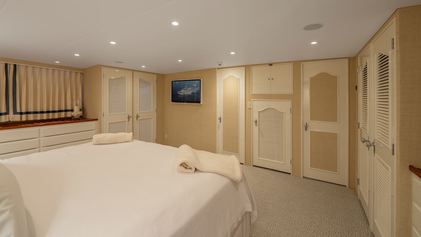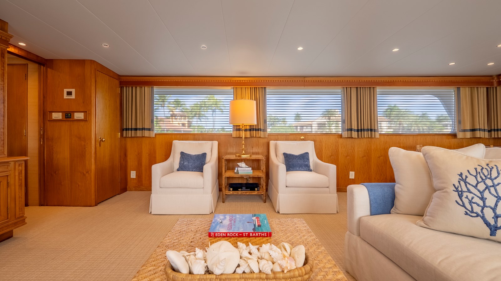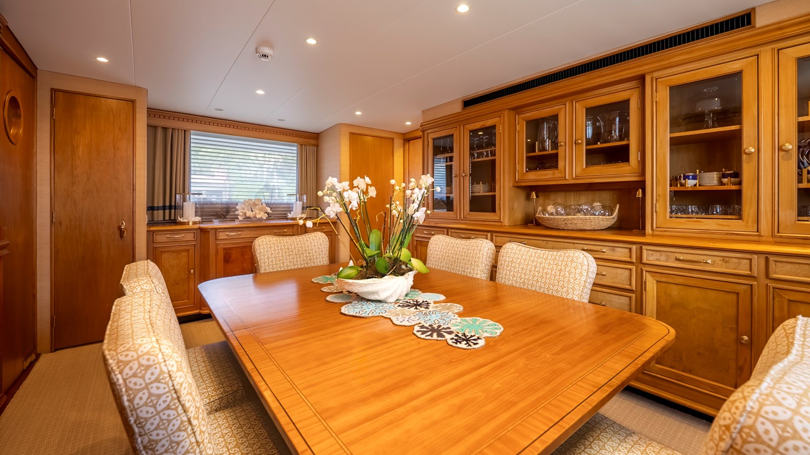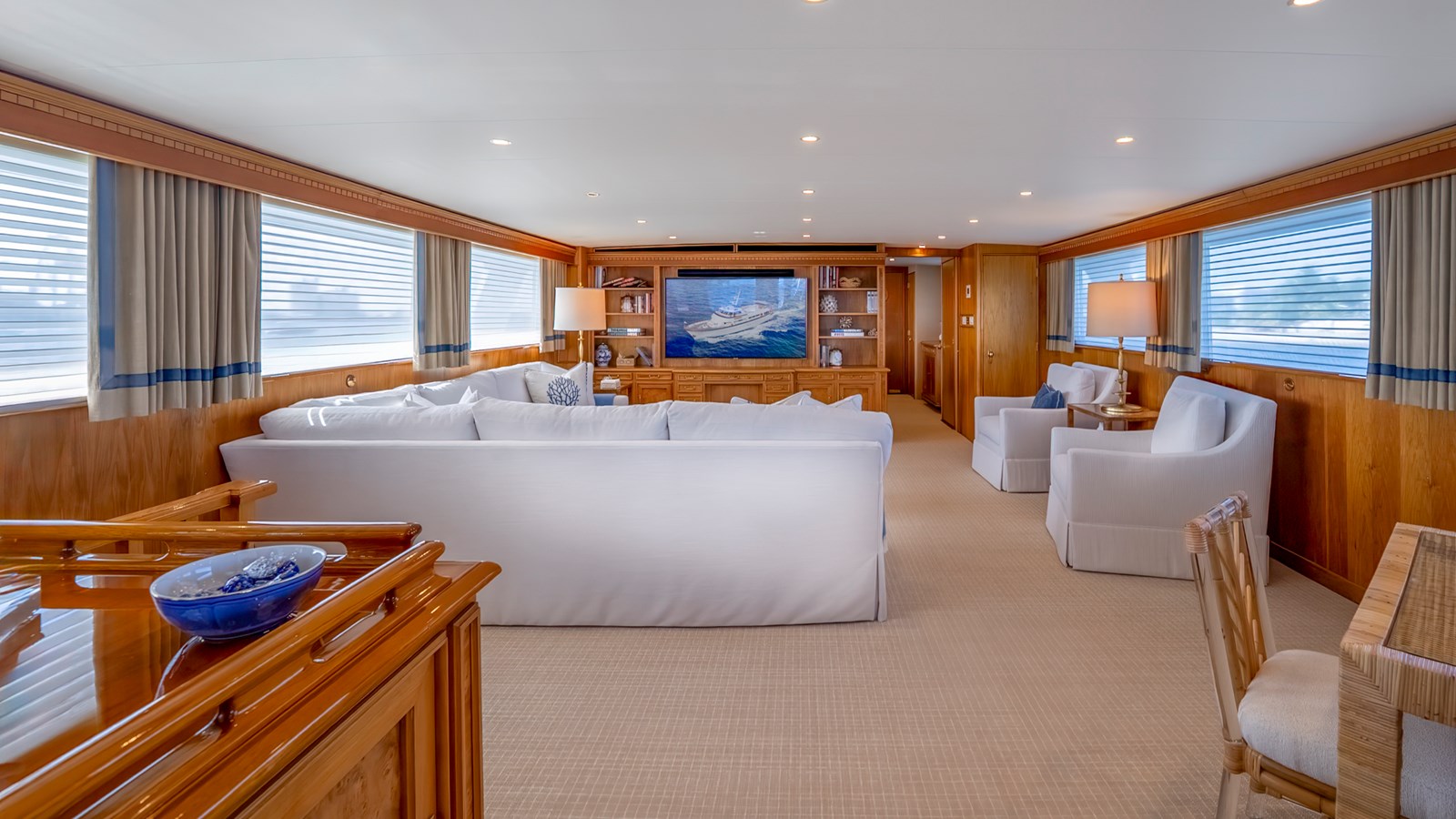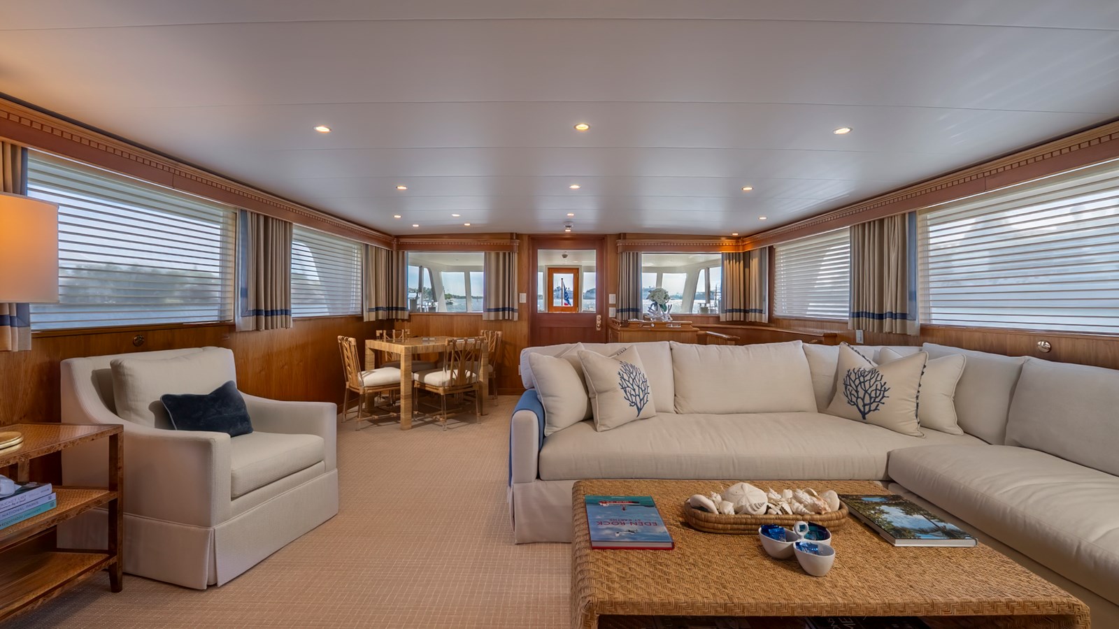 Stepping aboard STONEFACE, one immediately recognizes the pedigree and classic charm of this Burger-built yacht — solid, beautifully maintained, and thoughtfully designed for comfortable cruising. Boarding from the starboard side aft boarding ladder and walking aft, you enter through a side, hinged door into the enclosed main deck aft, a full-beam space surrounded by large windows. Both port and starboard side windows open to allow natural airflow when desired. The area serves as a relaxed, social setting with a dining table for six and two built-in L-shaped sofas aft, offering ample seating for guests. Forward, twin service bars provide excellent storage and functionality, and include refrigeration, an icemaker, and a sink. Access to the expansive lazarette is through a hatch in the floor, aft of the dining table. A centrally located door between the aft sofas leads down three steps to the teak cockpit. Varnished cap rails surrounds the area, while a gate on the starboard side opens to the swim platform, accessed by another three steps concealed by a teak hatch in the deck. Returning to the enclosed aft deck, the space is fully air-conditioned and includes a discreet crew call button at the dining table for service when entertaining. Through a sliding centerline door, the main salon welcomes you with warm tones of butternut walnut joinery and soft, neutral furnishings. To starboard is a card table for four, ideal for a quiet game or conversation. To port, a curved staircase leads down to the guest accommodations. Six large windows flood the room with natural light, enhancing the sense of space. An L-shaped sofa upholstered in a light fabric faces forward toward and two brand new, comfortable armchairs are located to starboard. The television is mounted opposite the sofa, framed by shelving on either side and cabinetry below. End tables with lamps provide soft evening light, making the salon an inviting place to relax. Following the curved staircase in the aft main salon down, you arrive in the guest foyer. Aft lies the full-beam master cabin with king size bed, offering a calm and private retreat. The layout features built-in nightstands, cabinetry, and full-height closets to port and starboard, providing abundant storage. A cabinet opposite the berth adds additional storage space, and a wall-mounted television is positioned to port. The en suite bath, accessed to starboard, includes a single sink with ample storage below, twin mirrored medicine cabinets, and a tiled shower with a glass door and built-in bench. The space benefits from a porthole for natural light. The cabin itself has two portholes per side, creating an open, balanced feel. Forward of the master, a well-equipped stewardess laundry room includes a Miele washer and dryer, sink, and large storage closet. Continuing forward, a linen locker lines the passageway before reaching two identical twin guest cabins. Each features twin berths with a Pullman berth above, drawer storage, a full-height closet, two portholes, and a wall-mounted television. Both cabins have en suite baths with single sinks, medicine cabinets, glass-enclosed showers, and tilework. Back on the main deck, the formal dining area is positioned forward of the main salon and centered around a rectangular table with leaf for six. Large windows on both sides allow natural light to illuminate the space. Built-in cabinetry aft and to starboard provides storage for china, glassware, stemware, and linens, keeping the area tidy and functional. Through a swinging wooden door forward, you enter the stew galley, finished in butternut walnut with a butcher block countertop and beautiful teak and holly flooring. The space is fitted with a Hoshizaki icemaker, Kenmore sink, KitchenAid dishwasher, U-Line wine refrigerator, Continental half-size refrigerator, and GE microwave. Wall-mounted cabinets provide additional pantry storage. To starboard, a day head features a toilet, sink, and mirror with polished stone accents. Behind the entry door, a coat closet is conveniently located. Side doors on both port and starboard sides lead to the exterior decks for easy crew and guest access. Continuing forward, the main galley spans the full beam and is finished with stunning, stainless steel counters and backsplash behind the cooktop. Appliances include a Wolf induction cooktop, Wolf oven, GE oven, GE microwave, three Samsung refrigerator/freezers, a large stainless sink with dual drains, a Miele dishwasher, and a pot filler. The space enjoys excellent natural light from windows on both sides and is thoughtfully laid out for professional use, with extensive storage and work surfaces for meal preparation. A curved staircase leads from the stew galley up to the pilothouse, a bright and functional space featuring a built-in settee and rectangular table to port, as well as teak and holly sole. Two helm chairs face a well-organized console with classic wheel and controls. Chart storage is located to starboard, and large windows ensure excellent visibility. Aft of the pilothouse is a compact cabin with a single berth- an ideal space for use on overnight passages. A head is located cross from the cabin with toilet and sink. Side doors on both sides of the pilothouse provide quick access to the wing stations for docking and maneuvering. Access to the flybridge is gained through doors to both port and starboard sides from the pilothouse. The deck surface is finished in a combination of teak and non-skid. This area serves as storage for the inflatable tender, two cranes, and any additional water toys. Aft, she features a teak seating area with u-shaped seating and a dining table for four, complemented by removable sunshades for comfort and versatility. Crew accommodations are accessed from the port side of the stew galley, down a curved staircase with handrail. The crew mess features an L-shaped settee with a triangular table, Zephyr refrigerator, GE microwave, and Samsung television that dou