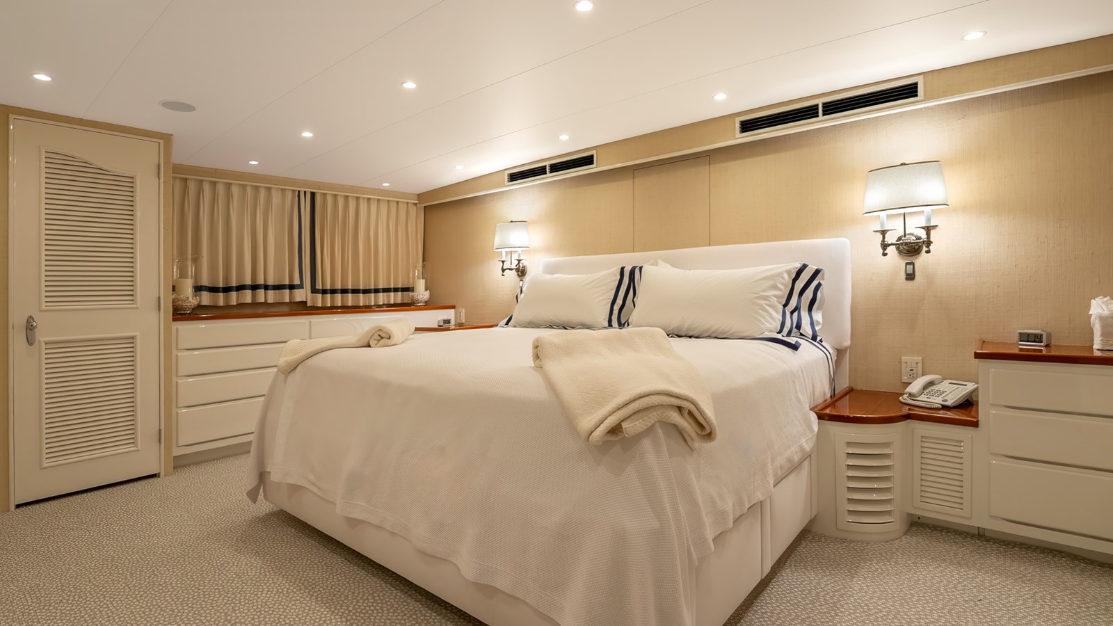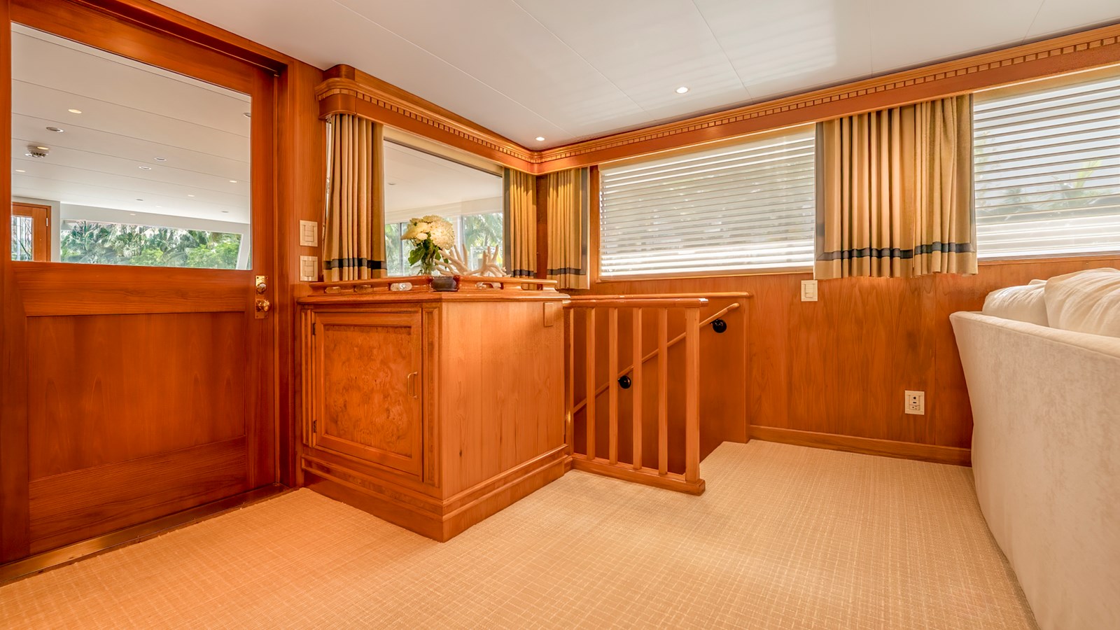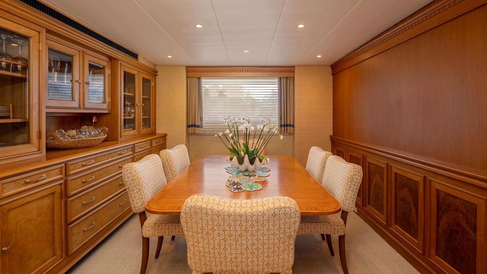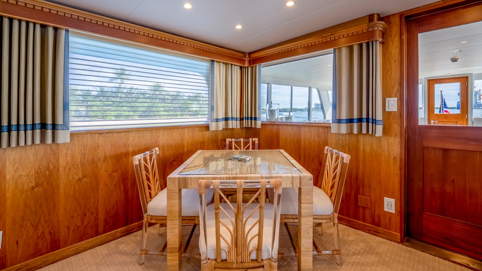 Stepping aboard STONEFACE, one immediately recognizes the pedigree and classic charm of this Burger-built yacht — solid, beautifully maintained, and thoughtfully designed for comfortable cruising. Boarding from the starboard side aft boarding ladder and walking aft, you enter through a side, hinged door into the enclosed main deck aft, a full-beam space surrounded by large windows. Both port and starboard side windows open to allow natural airflow when desired. The area serves as a relaxed, social setting with a dining table for six and two built-in L-shaped sofas aft, offering ample seating for guests. Forward, twin service bars provide excellent storage and functionality, and include refrigeration, an icemaker, and a sink. Access to the expansive lazarette is through a hatch in the floor, aft of the dining table. A centrally located door between the aft sofas leads down three steps to the teak cockpit. Varnished cap rails surrounds the area, while a gate on the starboard side opens to the swim platform, accessed by another three steps concealed by a teak hatch in the deck. Returning to the enclosed aft deck, the space is fully air-conditioned and includes a discreet crew call button at the dining table for service when entertaining. Through a sliding centerline door, the main salon welcomes you with warm tones of butternut walnut joinery and soft, neutral furnishings. To starboard is a card table for four, ideal for a quiet game or conversation. To port, a curved staircase leads down to the guest accommodations. Six large windows flood the room with natural light, enhancing the sense of space. An L-shaped sofa upholstered in a light fabric faces forward toward and two brand new, comfortable armchairs are located to starboard. The television is mounted opposite the sofa, framed by shelving on either side and cabinetry below. End tables with lamps provide soft evening light, making the salon an inviting place to relax. Following the curved staircase in the aft main salon down, you arrive in the guest foyer. Aft lies the full-beam master cabin with king size bed, offering a calm and private retreat. The layout features built-in nightstands, cabinetry, and full-height closets to port and starboard, providing abundant storage. A cabinet opposite the berth adds additional storage space, and a wall-mounted television is positioned to port. The en suite bath, accessed to starboard, includes a single sink with ample storage below, twin mirrored medicine cabinets, and a tiled shower with a glass door and built-in bench. The space benefits from a porthole for natural light. The cabin itself has two portholes per side, creating an open, balanced feel. Forward of the master, a well-equipped stewardess laundry room includes a Miele washer and dryer, sink, and large storage closet. Continuing forward, a linen locker lines the passageway before reaching two identical twin guest cabins. Each features twin berths with a Pullman berth above, drawer storage, a full-height closet, two portholes, and a wall-mounted television. Both cabins have en suite baths with single sinks, medicine cabinets, glass-enclosed showers, and tilework. Back on the main deck, the formal dining area is positioned forward of the main salon and centered around a rectangular table with leaf for six. Large windows on both sides allow natural light to illuminate the space. Built-in cabinetry aft and to starboard provides storage for china, glassware, stemware, and linens, keeping the area tidy and functional. Through a swinging wooden door forward, you enter the stew galley, finished in butternut walnut with a butcher block countertop and beautiful teak and holly flooring. The space is fitted with a Hoshizaki icemaker, Kenmore sink, KitchenAid dishwasher, U-Line wine refrigerator, Continental half-size refrigerator, and GE microwave. Wall-mounted cabinets provide additional pantry storage. To starboard, a day head features a toilet, sink, and mirror with polished stone accents. Behind the entry door, a coat closet is conveniently located. Side doors on both port and starboard sides lead to the exterior decks for easy crew and guest access. Continuing forward, the main galley spans the full beam and is finished with stunning, stainless steel counters and backsplash behind the cooktop. Appliances include a Wolf induction cooktop, Wolf oven, GE oven, GE microwave, three Samsung refrigerator/freezers, a large stainless sink with dual drains, a Miele dishwasher, and a pot filler. The space enjoys excellent natural light from windows on both sides and is thoughtfully laid out for professional use, with extensive storage and work surfaces for meal preparation. A curved staircase leads from the stew galley up to the pilothouse, a bright and functional space featuring a built-in settee and rectangular table to port, as well as teak and holly sole. Two helm chairs face a well-organized console with classic wheel and controls. Chart storage is located to starboard, and large windows ensure excellent visibility. Aft of the pilothouse is a compact cabin with a single berth- an ideal space for use on overnight passages. A head is located cross from the cabin with toilet and sink. Side doors on both sides of the pilothouse provide quick access to the wing stations for docking and maneuvering. Access to the flybridge is gained through doors to both port and starboard sides from the pilothouse. The deck surface is finished in a combination of teak and non-skid. This area serves as storage for the inflatable tender, two cranes, and any additional water toys. Aft, she features a teak seating area with u-shaped seating and a dining table for four, complemented by removable sunshades for comfort and versatility. Crew accommodations are accessed from the port side of the stew galley, down a curved staircase with handrail. The crew mess features an L-shaped settee with a triangular table, Zephyr refrigerator, GE microwave, and Samsung television that dou