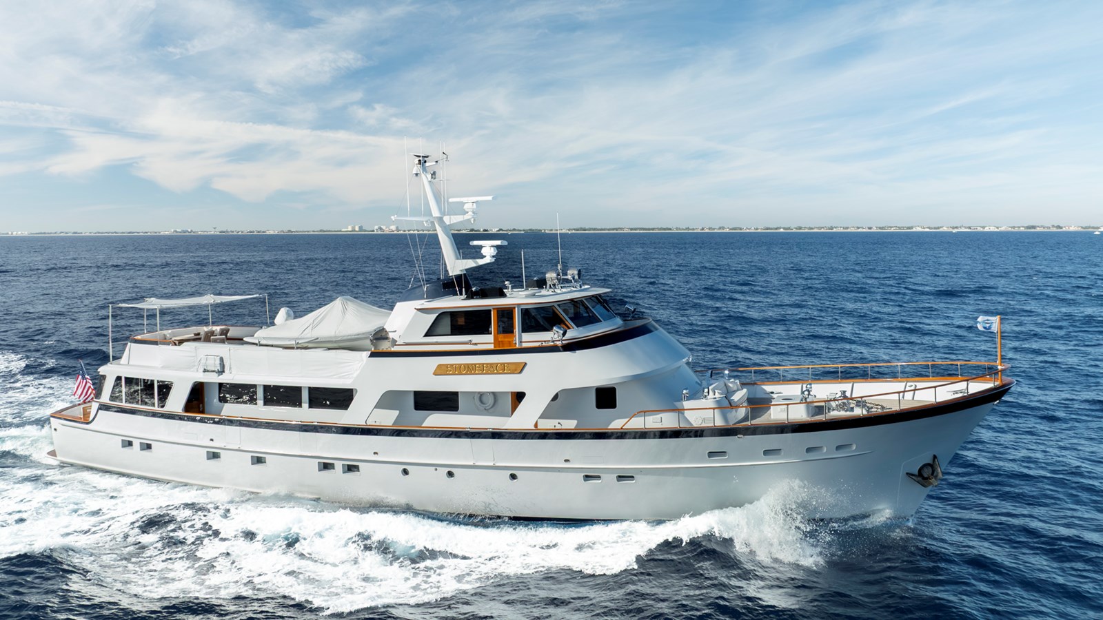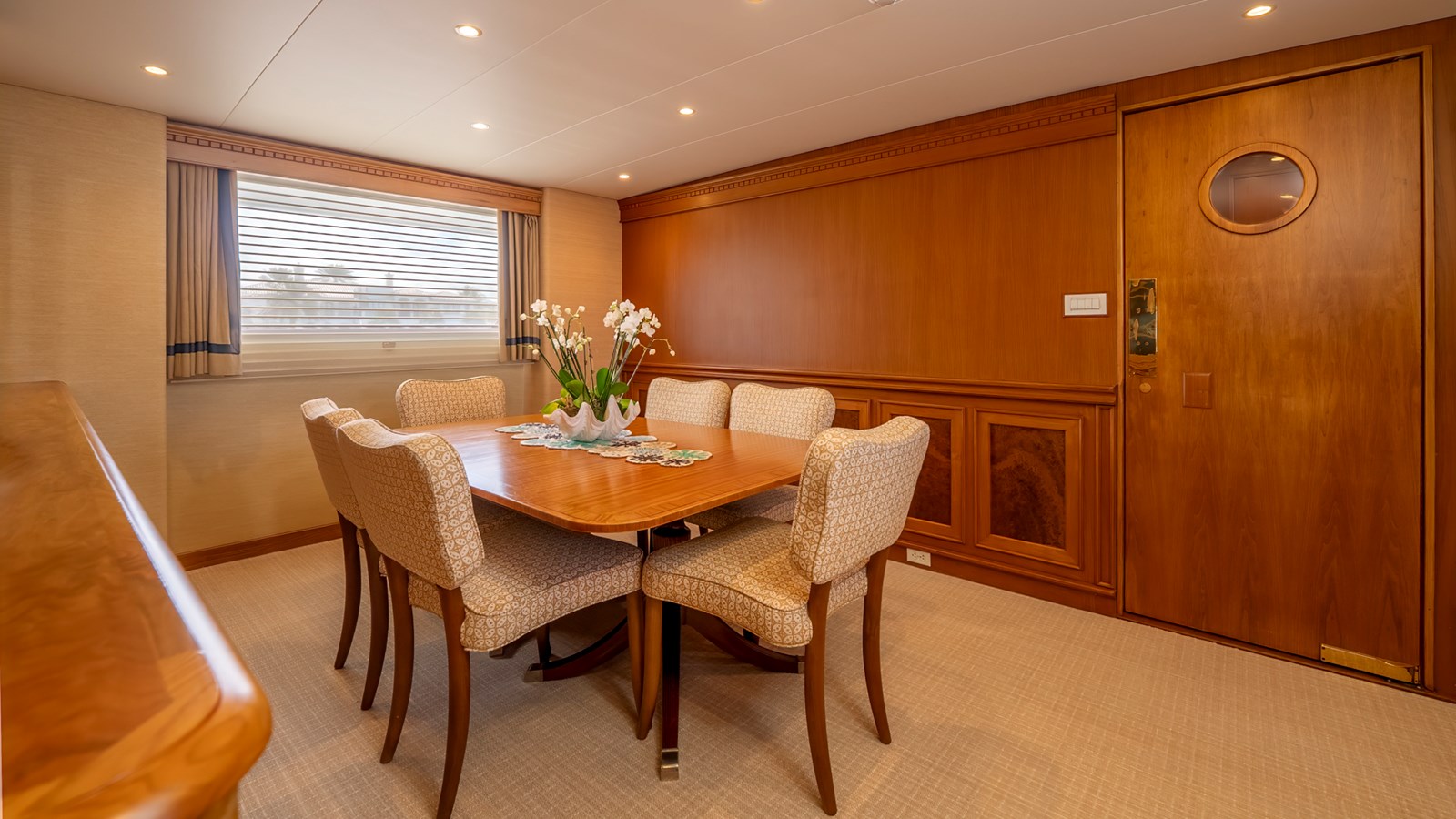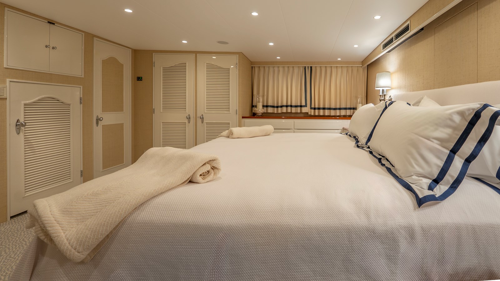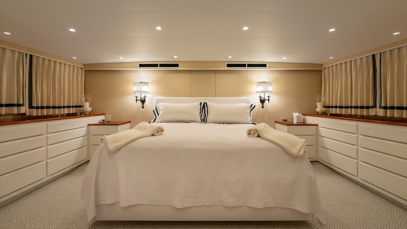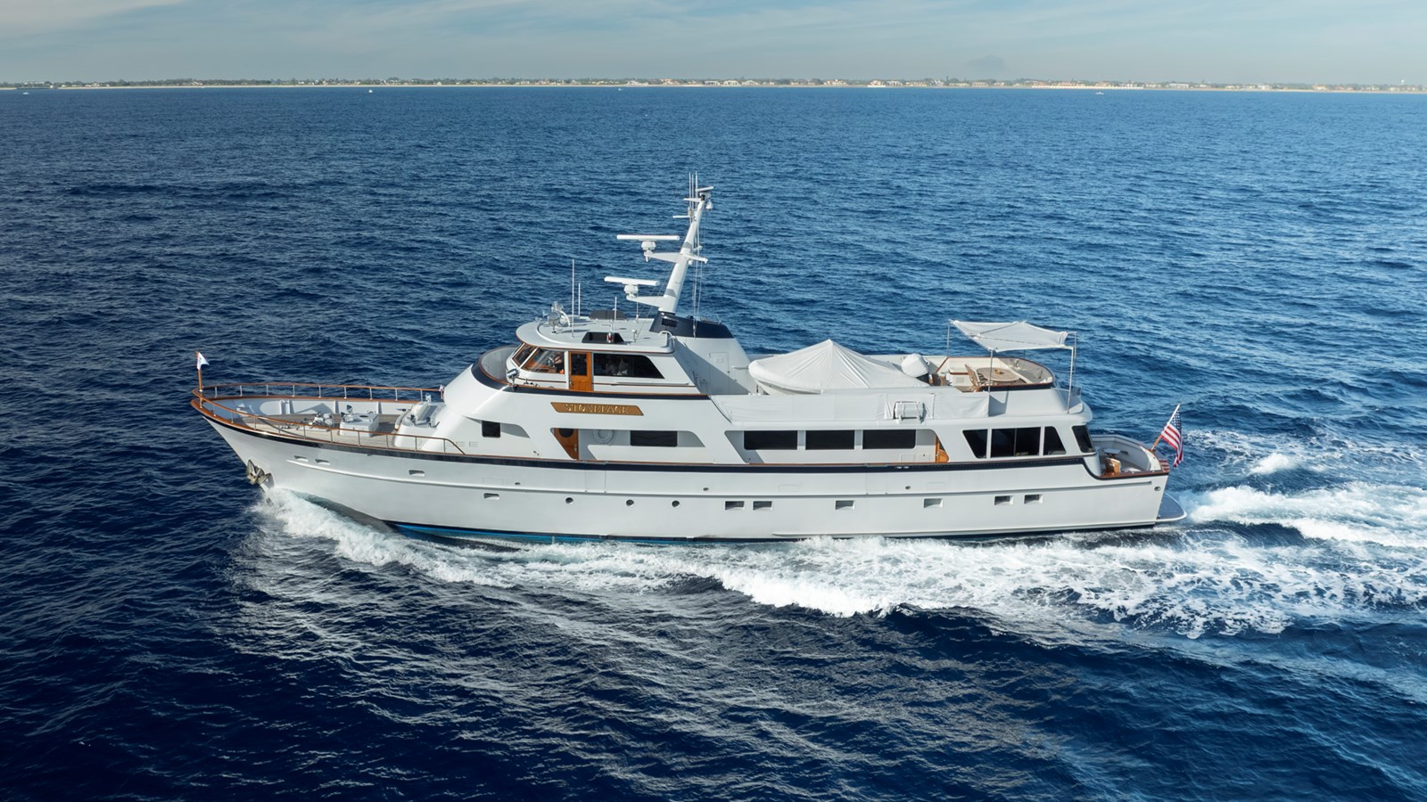 Stepping aboard STONEFACE, one immediately recognizes the pedigree and classic charm of this Burger-built yacht — solid, beautifully maintained, and thoughtfully designed for comfortable cruising. Boarding from the starboard side aft boarding ladder and walking aft, you enter through a side, hinged door into the enclosed main deck aft, a full-beam space surrounded by large windows. Both port and starboard side windows open to allow natural airflow when desired. The area serves as a relaxed, social setting with a dining table for six and two built-in L-shaped sofas aft, offering ample seating for guests. Forward, twin service bars provide excellent storage and functionality, and include refrigeration, an icemaker, and a sink. Access to the expansive lazarette is through a hatch in the floor, aft of the dining table. A centrally located door between the aft sofas leads down three steps to the teak cockpit. Varnished cap rails surrounds the area, while a gate on the starboard side opens to the swim platform, accessed by another three steps concealed by a teak hatch in the deck. Returning to the enclosed aft deck, the space is fully air-conditioned and includes a discreet crew call button at the dining table for service when entertaining. Through a sliding centerline door, the main salon welcomes you with warm tones of butternut walnut joinery and soft, neutral furnishings. To starboard is a card table for four, ideal for a quiet game or conversation. To port, a curved staircase leads down to the guest accommodations. Six large windows flood the room with natural light, enhancing the sense of space. An L-shaped sofa upholstered in a light fabric faces forward toward and two brand new, comfortable armchairs are located to starboard. The television is mounted opposite the sofa, framed by shelving on either side and cabinetry below. End tables with lamps provide soft evening light, making the salon an inviting place to relax. Following the curved staircase in the aft main salon down, you arrive in the guest foyer. Aft lies the full-beam master cabin with king size bed, offering a calm and private retreat. The layout features built-in nightstands, cabinetry, and full-height closets to port and starboard, providing abundant storage. A cabinet opposite the berth adds additional storage space, and a wall-mounted television is positioned to port. The en suite bath, accessed to starboard, includes a single sink with ample storage below, twin mirrored medicine cabinets, and a tiled shower with a glass door and built-in bench. The space benefits from a porthole for natural light. The cabin itself has two portholes per side, creating an open, balanced feel. Forward of the master, a well-equipped stewardess laundry room includes a Miele washer and dryer, sink, and large storage closet. Continuing forward, a linen locker lines the passageway before reaching two identical twin guest cabins. Each features twin berths with a Pullman berth above, drawer storage, a full-height closet, two portholes, and a wall-mounted television. Both cabins have en suite baths with single sinks, medicine cabinets, glass-enclosed showers, and tilework. Back on the main deck, the formal dining area is positioned forward of the main salon and centered around a rectangular table with leaf for six. Large windows on both sides allow natural light to illuminate the space. Built-in cabinetry aft and to starboard provides storage for china, glassware, stemware, and linens, keeping the area tidy and functional. Through a swinging wooden door forward, you enter the stew galley, finished in butternut walnut with a butcher block countertop and beautiful teak and holly flooring. The space is fitted with a Hoshizaki icemaker, Kenmore sink, KitchenAid dishwasher, U-Line wine refrigerator, Continental half-size refrigerator, and GE microwave. Wall-mounted cabinets provide additional pantry storage. To starboard, a day head features a toilet, sink, and mirror with polished stone accents. Behind the entry door, a coat closet is conveniently located. Side doors on both port and starboard sides lead to the exterior decks for easy crew and guest access. Continuing forward, the main galley spans the full beam and is finished with stunning, stainless steel counters and backsplash behind the cooktop. Appliances include a Wolf induction cooktop, Wolf oven, GE oven, GE microwave, three Samsung refrigerator/freezers, a large stainless sink with dual drains, a Miele dishwasher, and a pot filler. The space enjoys excellent natural light from windows on both sides and is thoughtfully laid out for professional use, with extensive storage and work surfaces for meal preparation. A curved staircase leads from the stew galley up to the pilothouse, a bright and functional space featuring a built-in settee and rectangular table to port, as well as teak and holly sole. Two helm chairs face a well-organized console with classic wheel and controls. Chart storage is located to starboard, and large windows ensure excellent visibility. Aft of the pilothouse is a compact cabin with a single berth- an ideal space for use on overnight passages. A head is located cross from the cabin with toilet and sink. Side doors on both sides of the pilothouse provide quick access to the wing stations for docking and maneuvering. Access to the flybridge is gained through doors to both port and starboard sides from the pilothouse. The deck surface is finished in a combination of teak and non-skid. This area serves as storage for the inflatable tender, two cranes, and any additional water toys. Aft, she features a teak seating area with u-shaped seating and a dining table for four, complemented by removable sunshades for comfort and versatility. Crew accommodations are accessed from the port side of the stew galley, down a curved staircase with handrail. The crew mess features an L-shaped settee with a triangular table, Zephyr refrigerator, GE microwave, and Samsung television that dou
