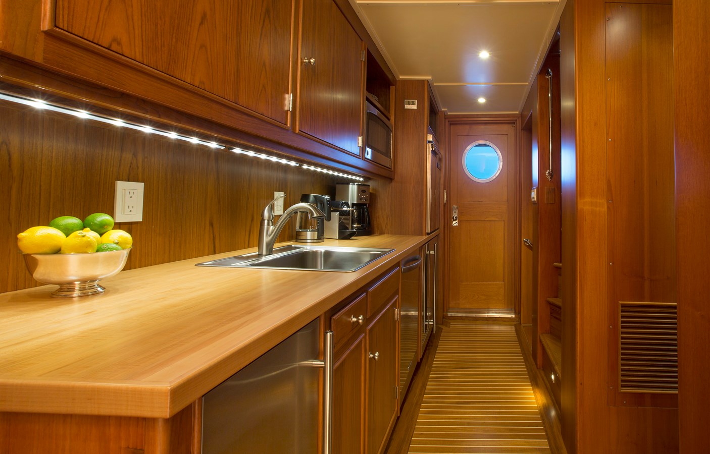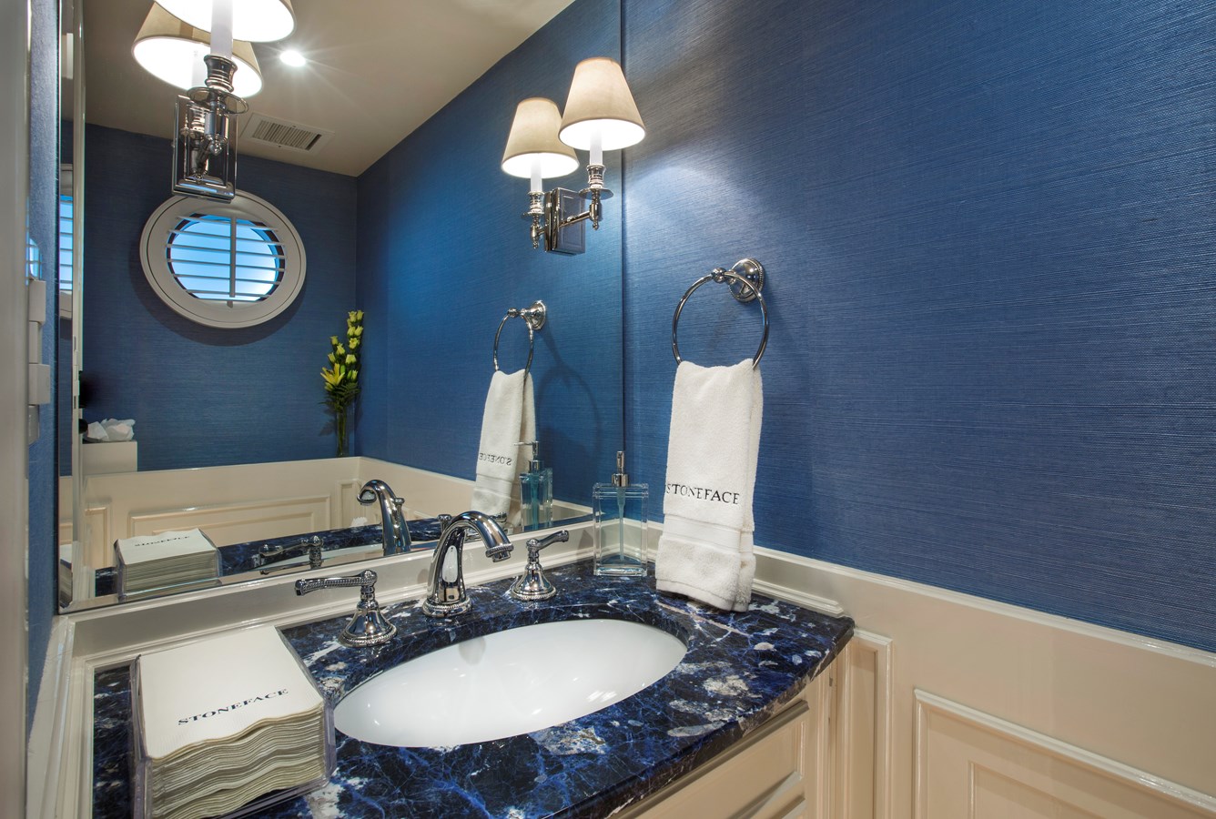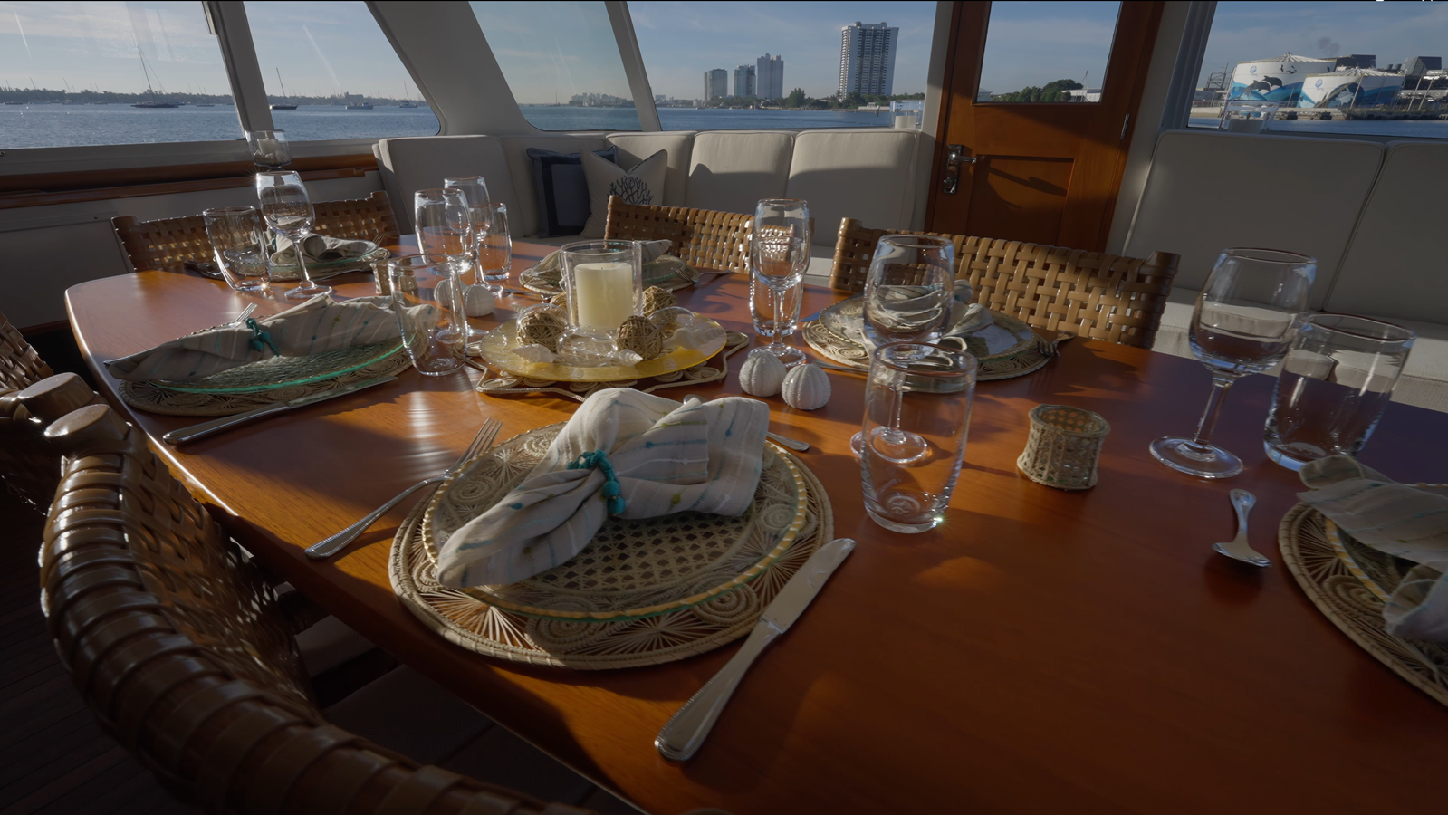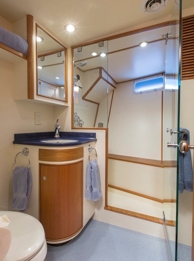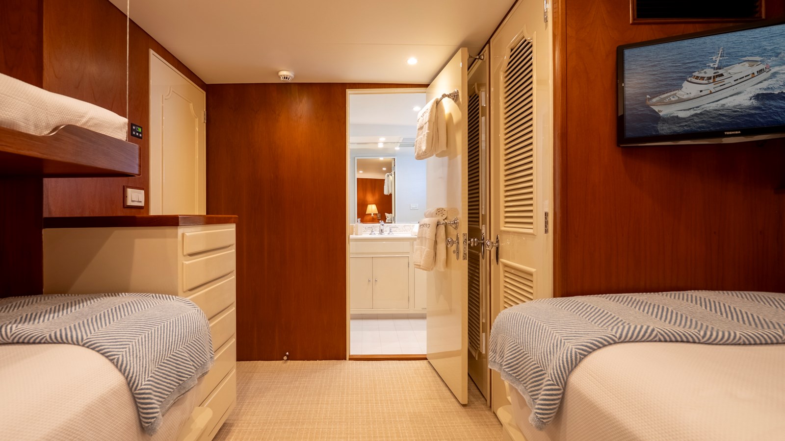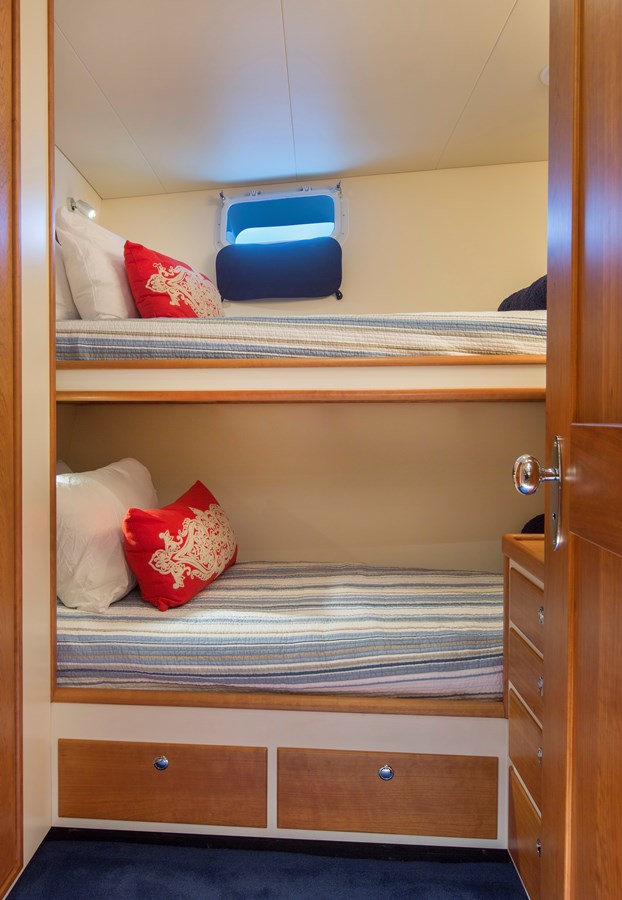 Stepping aboard STONEFACE, one immediately recognizes the pedigree and classic charm of this Burger-built yacht — solid, beautifully maintained, and thoughtfully designed for comfortable cruising. Boarding from the starboard side aft boarding ladder and walking aft, you enter through a side, hinged door into the enclosed main deck aft, a full-beam space surrounded by large windows. Both port and starboard side windows open to allow natural airflow when desired. The area serves as a relaxed, social setting with a dining table for six and two built-in L-shaped sofas aft, offering ample seating for guests. Forward, twin service bars provide excellent storage and functionality, and include refrigeration, an icemaker, and a sink. Access to the expansive lazarette is through a hatch in the floor, aft of the dining table. A centrally located door between the aft sofas leads down three steps to the teak cockpit. Varnished cap rails surrounds the area, while a gate on the starboard side opens to the swim platform, accessed by another three steps concealed by a teak hatch in the deck. Returning to the enclosed aft deck, the space is fully air-conditioned and includes a discreet crew call button at the dining table for service when entertaining. Through a sliding centerline door, the main salon welcomes you with warm tones of butternut walnut joinery and soft, neutral furnishings. To starboard is a card table for four, ideal for a quiet game or conversation. To port, a curved staircase leads down to the guest accommodations. Six large windows flood the room with natural light, enhancing the sense of space. An L-shaped sofa upholstered in a light fabric faces forward toward and two brand new, comfortable armchairs are located to starboard. The television is mounted opposite the sofa, framed by shelving on either side and cabinetry below. End tables with lamps provide soft evening light, making the salon an inviting place to relax. Following the curved staircase in the aft main salon down, you arrive in the guest foyer. Aft lies the full-beam master cabin with king size bed, offering a calm and private retreat. The layout features built-in nightstands, cabinetry, and full-height closets to port and starboard, providing abundant storage. A cabinet opposite the berth adds additional storage space, and a wall-mounted television is positioned to port. The en suite bath, accessed to starboard, includes a single sink with ample storage below, twin mirrored medicine cabinets, and a tiled shower with a glass door and built-in bench. The space benefits from a porthole for natural light. The cabin itself has two portholes per side, creating an open, balanced feel. Forward of the master, a well-equipped stewardess laundry room includes a Miele washer and dryer, sink, and large storage closet. Continuing forward, a linen locker lines the passageway before reaching two identical twin guest cabins. Each features twin berths with a Pullman berth above, drawer storage, a full-height closet, two portholes, and a wall-mounted television. Both cabins have en suite baths with single sinks, medicine cabinets, glass-enclosed showers, and tilework. Back on the main deck, the formal dining area is positioned forward of the main salon and centered around a rectangular table with leaf for six. Large windows on both sides allow natural light to illuminate the space. Built-in cabinetry aft and to starboard provides storage for china, glassware, stemware, and linens, keeping the area tidy and functional. Through a swinging wooden door forward, you enter the stew galley, finished in butternut walnut with a butcher block countertop and beautiful teak and holly flooring. The space is fitted with a Hoshizaki icemaker, Kenmore sink, KitchenAid dishwasher, U-Line wine refrigerator, Continental half-size refrigerator, and GE microwave. Wall-mounted cabinets provide additional pantry storage. To starboard, a day head features a toilet, sink, and mirror with polished stone accents. Behind the entry door, a coat closet is conveniently located. Side doors on both port and starboard sides lead to the exterior decks for easy crew and guest access. Continuing forward, the main galley spans the full beam and is finished with stunning, stainless steel counters and backsplash behind the cooktop. Appliances include a Wolf induction cooktop, Wolf oven, GE oven, GE microwave, three Samsung refrigerator/freezers, a large stainless sink with dual drains, a Miele dishwasher, and a pot filler. The space enjoys excellent natural light from windows on both sides and is thoughtfully laid out for professional use, with extensive storage and work surfaces for meal preparation. A curved staircase leads from the stew galley up to the pilothouse, a bright and functional space featuring a built-in settee and rectangular table to port, as well as teak and holly sole. Two helm chairs face a well-organized console with classic wheel and controls. Chart storage is located to starboard, and large windows ensure excellent visibility. Aft of the pilothouse is a compact cabin with a single berth- an ideal space for use on overnight passages. A head is located cross from the cabin with toilet and sink. Side doors on both sides of the pilothouse provide quick access to the wing stations for docking and maneuvering. Access to the flybridge is gained through doors to both port and starboard sides from the pilothouse. The deck surface is finished in a combination of teak and non-skid. This area serves as storage for the inflatable tender, two cranes, and any additional water toys. Aft, she features a teak seating area with u-shaped seating and a dining table for four, complemented by removable sunshades for comfort and versatility. Crew accommodations are accessed from the port side of the stew galley, down a curved staircase with handrail. The crew mess features an L-shaped settee with a triangular table, Zephyr refrigerator, GE microwave, and Samsung television that dou