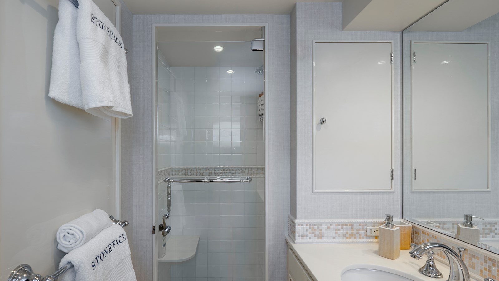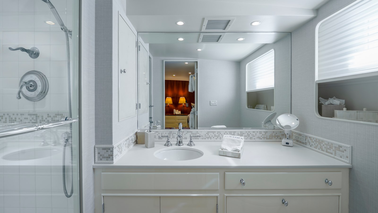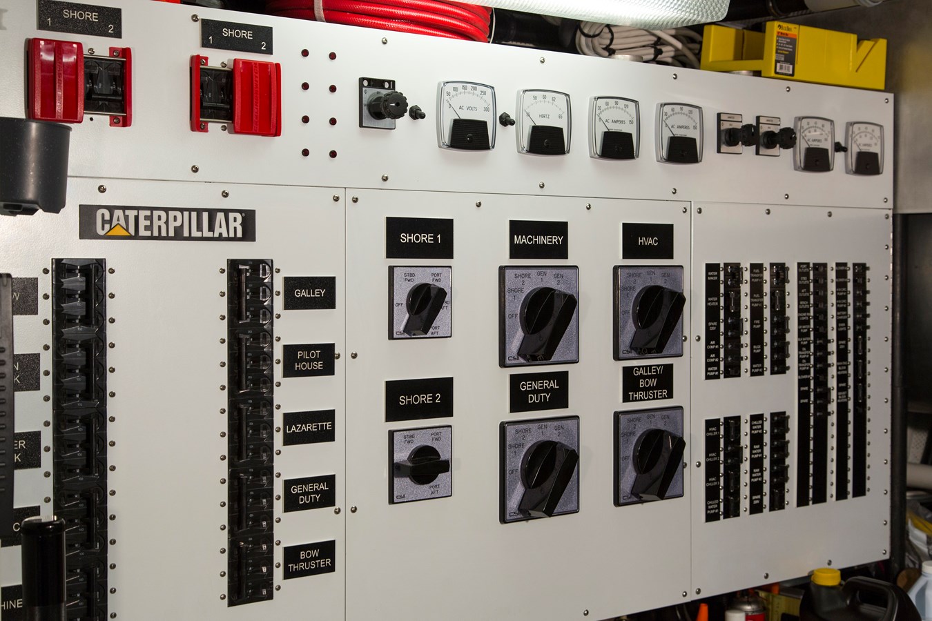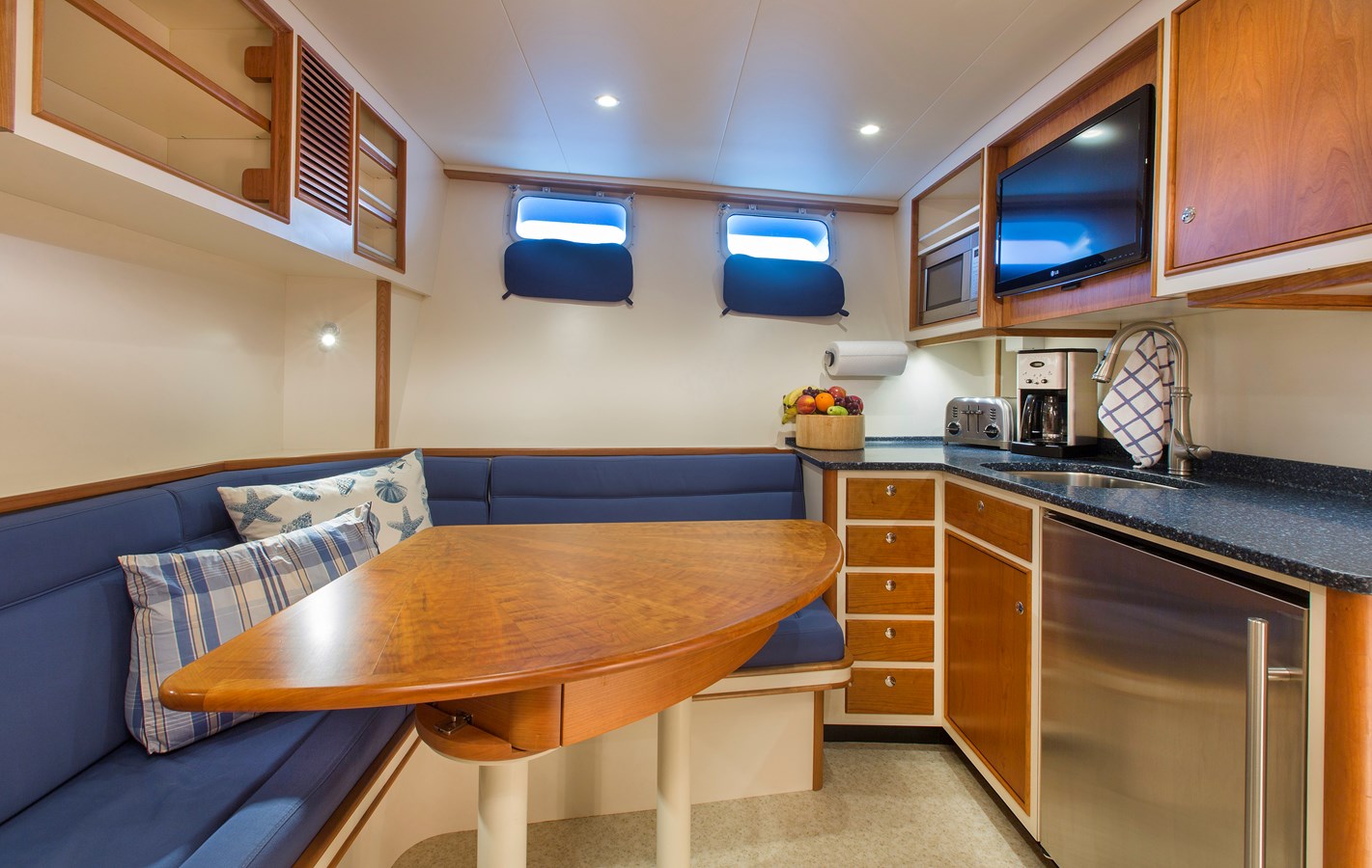 Stepping aboard STONEFACE, one immediately recognizes the pedigree and classic charm of this Burger-built yacht — solid, beautifully maintained, and thoughtfully designed for comfortable cruising. Boarding from the starboard side aft boarding ladder and walking aft, you enter through a side, hinged door into the enclosed main deck aft, a full-beam space surrounded by large windows. Both port and starboard side windows open to allow natural airflow when desired. The area serves as a relaxed, social setting with a dining table for six and two built-in L-shaped sofas aft, offering ample seating for guests. Forward, twin service bars provide excellent storage and functionality, and include refrigeration, an icemaker, and a sink. Access to the expansive lazarette is through a hatch in the floor, aft of the dining table. A centrally located door between the aft sofas leads down three steps to the teak cockpit. Varnished cap rails surrounds the area, while a gate on the starboard side opens to the swim platform, accessed by another three steps concealed by a teak hatch in the deck. Returning to the enclosed aft deck, the space is fully air-conditioned and includes a discreet crew call button at the dining table for service when entertaining. Through a sliding centerline door, the main salon welcomes you with warm tones of butternut walnut joinery and soft, neutral furnishings. To starboard is a card table for four, ideal for a quiet game or conversation. To port, a curved staircase leads down to the guest accommodations. Six large windows flood the room with natural light, enhancing the sense of space. An L-shaped sofa upholstered in a light fabric faces forward toward and two brand new, comfortable armchairs are located to starboard. The television is mounted opposite the sofa, framed by shelving on either side and cabinetry below. End tables with lamps provide soft evening light, making the salon an inviting place to relax. Following the curved staircase in the aft main salon down, you arrive in the guest foyer. Aft lies the full-beam master cabin with king size bed, offering a calm and private retreat. The layout features built-in nightstands, cabinetry, and full-height closets to port and starboard, providing abundant storage. A cabinet opposite the berth adds additional storage space, and a wall-mounted television is positioned to port. The en suite bath, accessed to starboard, includes a single sink with ample storage below, twin mirrored medicine cabinets, and a tiled shower with a glass door and built-in bench. The space benefits from a porthole for natural light. The cabin itself has two portholes per side, creating an open, balanced feel. Forward of the master, a well-equipped stewardess laundry room includes a Miele washer and dryer, sink, and large storage closet. Continuing forward, a linen locker lines the passageway before reaching two identical twin guest cabins. Each features twin berths with a Pullman berth above, drawer storage, a full-height closet, two portholes, and a wall-mounted television. Both cabins have en suite baths with single sinks, medicine cabinets, glass-enclosed showers, and tilework. Back on the main deck, the formal dining area is positioned forward of the main salon and centered around a rectangular table with leaf for six. Large windows on both sides allow natural light to illuminate the space. Built-in cabinetry aft and to starboard provides storage for china, glassware, stemware, and linens, keeping the area tidy and functional. Through a swinging wooden door forward, you enter the stew galley, finished in butternut walnut with a butcher block countertop and beautiful teak and holly flooring. The space is fitted with a Hoshizaki icemaker, Kenmore sink, KitchenAid dishwasher, U-Line wine refrigerator, Continental half-size refrigerator, and GE microwave. Wall-mounted cabinets provide additional pantry storage. To starboard, a day head features a toilet, sink, and mirror with polished stone accents. Behind the entry door, a coat closet is conveniently located. Side doors on both port and starboard sides lead to the exterior decks for easy crew and guest access. Continuing forward, the main galley spans the full beam and is finished with stunning, stainless steel counters and backsplash behind the cooktop. Appliances include a Wolf induction cooktop, Wolf oven, GE oven, GE microwave, three Samsung refrigerator/freezers, a large stainless sink with dual drains, a Miele dishwasher, and a pot filler. The space enjoys excellent natural light from windows on both sides and is thoughtfully laid out for professional use, with extensive storage and work surfaces for meal preparation. A curved staircase leads from the stew galley up to the pilothouse, a bright and functional space featuring a built-in settee and rectangular table to port, as well as teak and holly sole. Two helm chairs face a well-organized console with classic wheel and controls. Chart storage is located to starboard, and large windows ensure excellent visibility. Aft of the pilothouse is a compact cabin with a single berth- an ideal space for use on overnight passages. A head is located cross from the cabin with toilet and sink. Side doors on both sides of the pilothouse provide quick access to the wing stations for docking and maneuvering. Access to the flybridge is gained through doors to both port and starboard sides from the pilothouse. The deck surface is finished in a combination of teak and non-skid. This area serves as storage for the inflatable tender, two cranes, and any additional water toys. Aft, she features a teak seating area with u-shaped seating and a dining table for four, complemented by removable sunshades for comfort and versatility. Crew accommodations are accessed from the port side of the stew galley, down a curved staircase with handrail. The crew mess features an L-shaped settee with a triangular table, Zephyr refrigerator, GE microwave, and Samsung television that dou